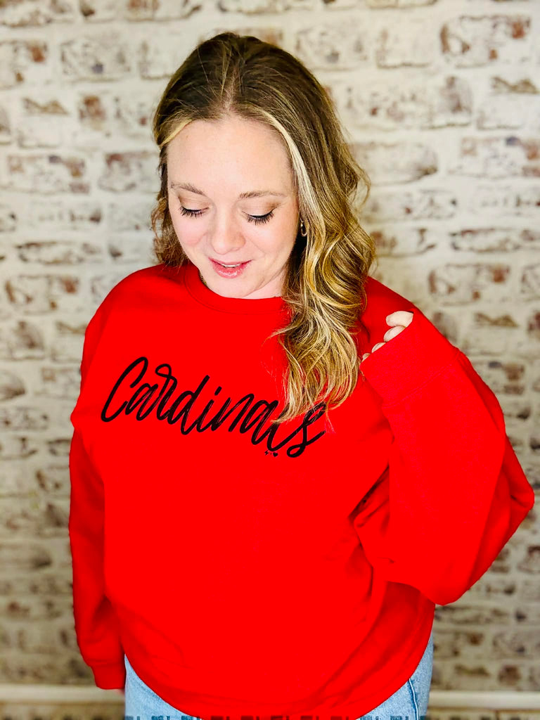 Get ready to join the flock in style with this unisex Gildan Fleece Sweatshirt! (It's true to size, but if you want a looser fit, size up.) With stylish black script writing and a gorgeous true red color, this sweatshirt is the perfect addition to any Cardinals fan's wardrobe. Represent your team from anywhere with this cozy and eye-catching sweatshirt.
