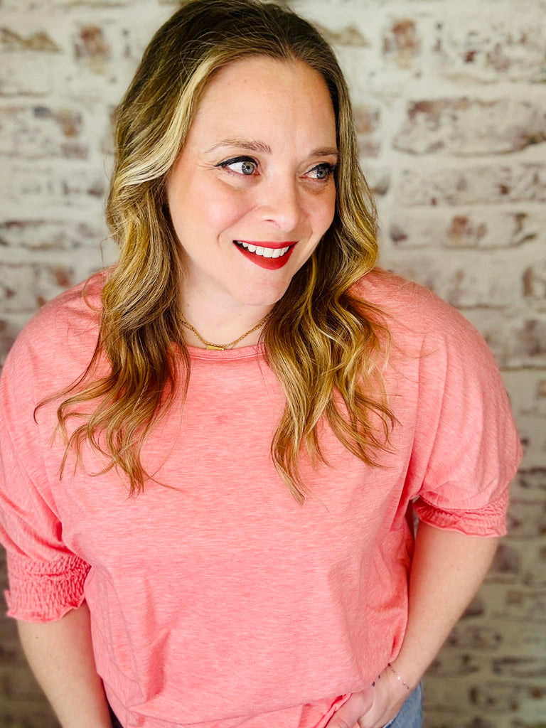 Slip into effortless comfort with this breezy long tee that's all about that relaxed vibe. The soft peach-pink hue brings warmth to any outfit, while the round neckline keeps things classic and easy. Those charming smocked sleeve cuffs at the elbow add just a touch of personality without trying too hard. Perfect for lounging, running errands, or whenever you want to feel put-together without the fuss.