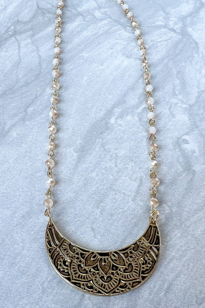 Single strand short chain link necklace with glass beads throughout the chain. Features a crescent shaped pendant with beautiful engraving on the front!